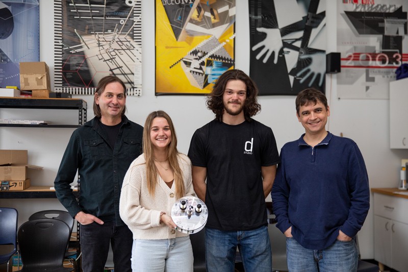 Ashley Pigford (far left), associate professor of art and design, leads a project — supported by the Maggie E. Neumann Health Sciences Research Fund — to advance his invention, the PushnDraw® assistive drawing device for children with upper limb disabilities. Pigford is working with Adam Wickenheiser (far right), associate professor of mechanical engineering, and mechanical engineering students Sara Dugan (second from left) and Logan Butler on this interdisciplinary research project.