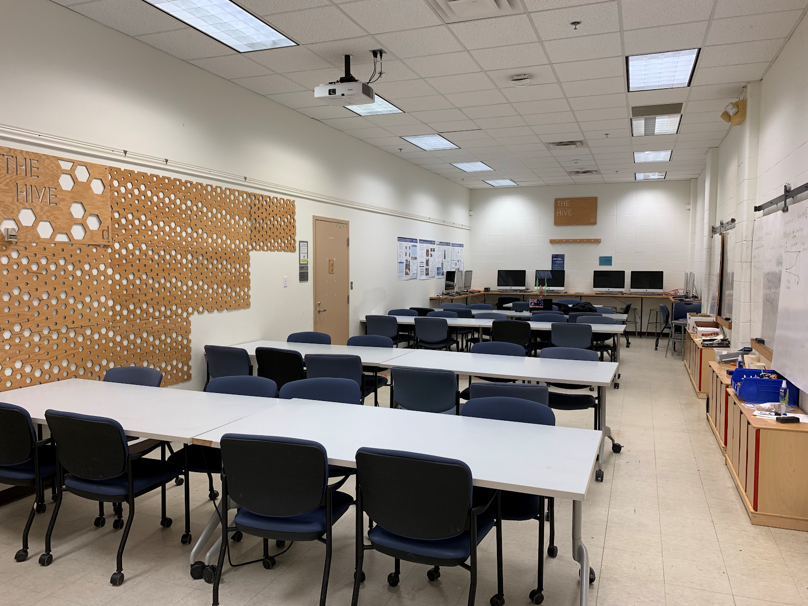 The Assembly Area is a collaborative workspace where students can study, work in groups, attend office hours, or use computers equipped with AppsAnywhere to access licensed engineering software. This space is open to all mechanical engineering students 24/7 to ensure students always have a comfortable place to meet and work.